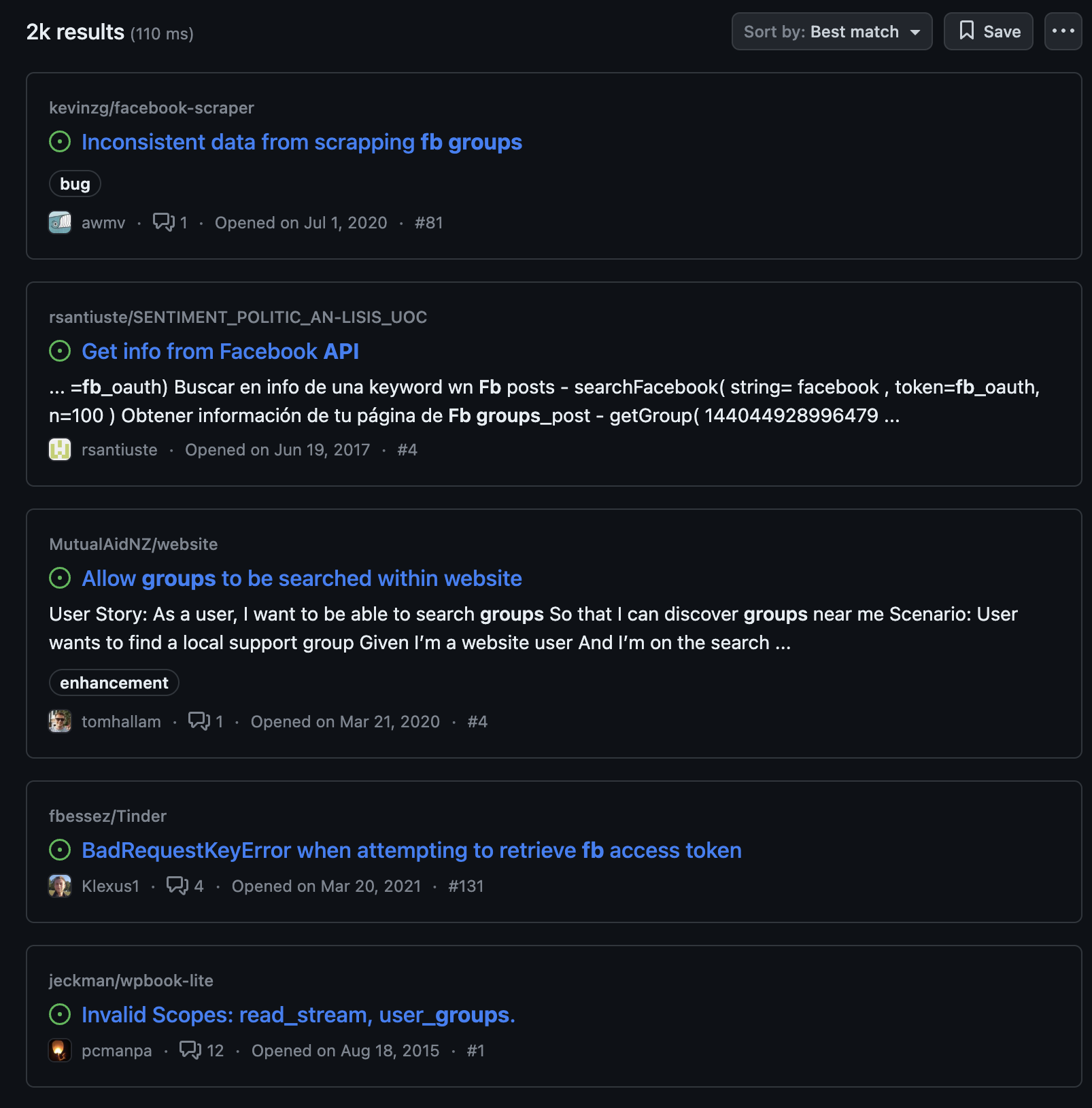 For example, check out this GitHub issue thread related to the “Facebook groups API”: